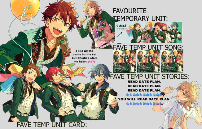August: I continue to listen to Date Plan A to Z whenever I can. I start manifesting A to Z Chiaki to come home to my main account when I scout. I reread the event story and its new translations.